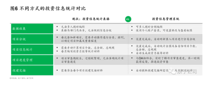 此外,我國生態(tài)環(huán)保產(chǎn)業(yè)數(shù)字化滲透率尚處于較低水平,即使是頭部企業(yè),也僅是在財務、行政、人力資源、工程等條線進行了IT系統(tǒng)建設(shè),投資管理的IT系統(tǒng)建設(shè)很少,更別提利用大數(shù)據(jù)、機器學習、人工智能等先進技術(shù)為投資決策提供支持了,不管是數(shù)據(jù)收集、還是項目分級、信息統(tǒng)計、進度管理、投建交接等工作,基本依靠手動操作,效率低下且容易出錯(見圖6)。