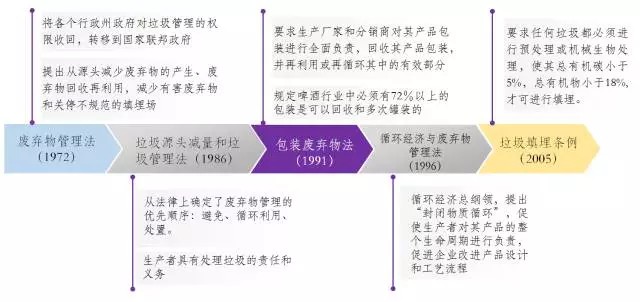 1991年頒布的《包裝廢棄物法》將包裝廢棄物的收集和處理責任從過去的各個行政州政府分攤給了各生產(chǎn)廠家、分銷商等企業(yè)機構,要求生產(chǎn)廠家和分銷商回收其產(chǎn)品包裝,并進行再利用,該法催生了德國著名的“二元回收系統(tǒng)”(即“綠點公司”),與公共環(huán)衛(wèi)回收系統(tǒng)平行運作。
