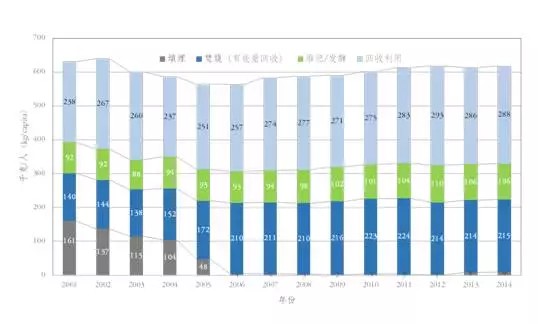 德國的生活垃圾處理方式總體可以歸為四類:填埋、有能量回收的焚燒、堆肥/發(fā)酵和回收利用,上圖反映了2001-2014年德國城市生活垃圾按不同方式的處理量。進入21世紀以來,德國城市生活垃圾的直接回收利用率和有機處理(堆肥發(fā)酵)率都有穩(wěn)步提升,直接回收利用率的增長更為顯著,從2001年的37.7%增長至2014年的46.6%。從2001年至2005年,德國的生活垃圾填埋量逐年下降,尤為值得注意的是,到2006年,生活垃圾填埋處理的占比已經(jīng)不足1%,這標志著德國城市生活垃圾正式開始進入“零填埋”時代。這一轉變與德國2005年頒布的《垃圾填埋條例》是密切相關的,根據(jù)條例,垃圾填埋基本只接收經(jīng)過垃圾生物處理或焚燒處理后的灰渣,因此大幅降低了生活垃圾的填埋量。
