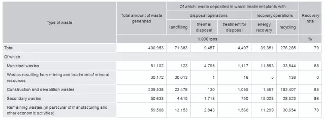 德國將生活垃圾的處理方式分為兩個大類:一是最終處置(disposal operations),二是資源化利用(recovery operations)。最終處置又包括填埋(landfilling)、熱處理(thermal disposal)和處置預處理(treatment for disposal)三種方式;資源化利用則包含回收(recycling)和能量回收(energy recovery)兩個方面。