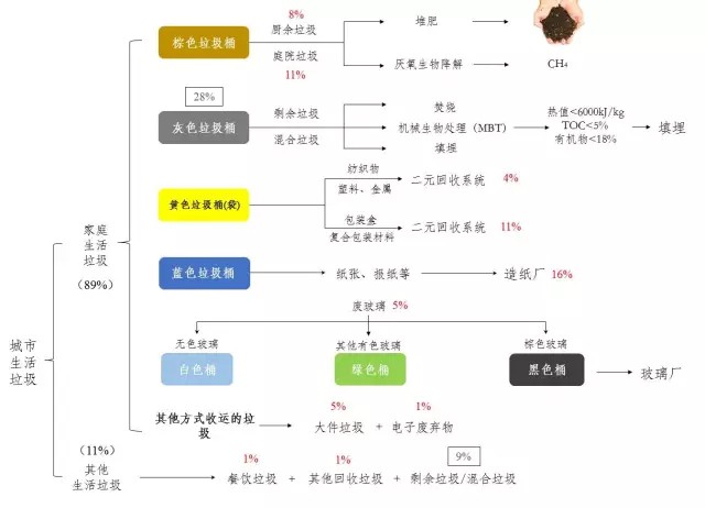 按照后續(xù)處理方式,生活垃圾又可分為分類收集的垃圾和剩余垃圾兩類。分類收集的垃圾包括廢紙、有機垃圾(殘余果蔬、園林垃圾等)、玻璃(分為棕色、綠色、白色)、輕質包裝廢棄物、大件垃圾(廢舊家具)及廢舊金屬、廢舊電池等多種類型。剩余垃圾則是其它不可回收的殘余廢棄物。