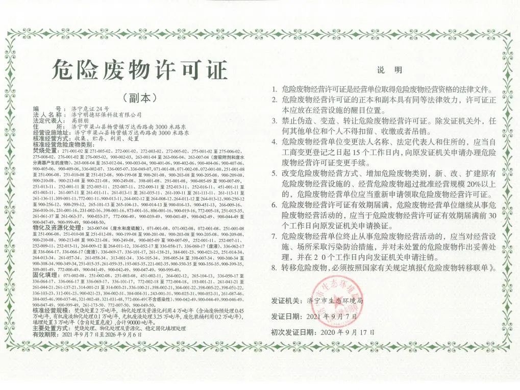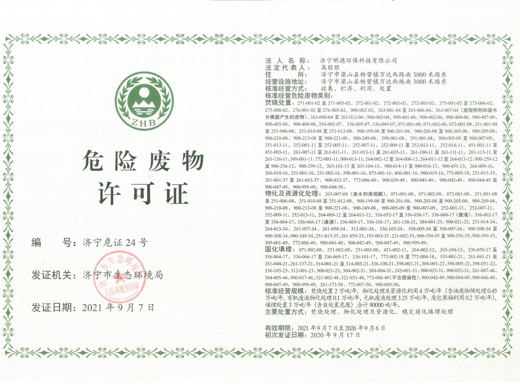 9月10日,雅居樂環(huán)保集團旗下濟寧明德環(huán)保科技有限公司(以下簡稱“濟寧明德項目”)喜獲濟寧市生態(tài)環(huán)境局頒發(fā)的5年期《危險廢物許可證》。這也是當?shù)貎H有的兩張5年期《危險廢物許可證》之一。