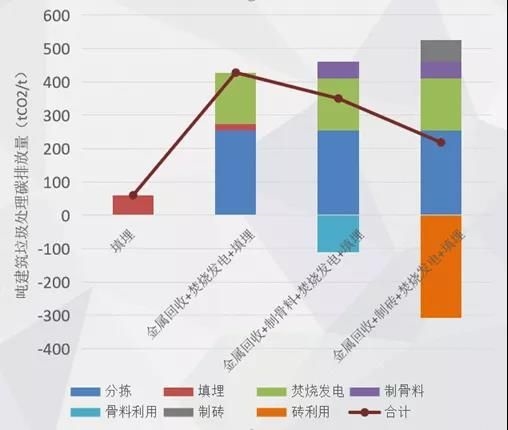 生命周期視角下,不同建筑垃圾處理工藝的碳排放有哪些不同呢?余毅介紹,對填埋、金屬回收、制骨料、制磚、雜質(zhì)焚燒等工藝組合進行生命周期視角的碳排放計算發(fā)現(xiàn),建筑垃圾填埋碳排放量最低;制磚工藝比制骨料工藝碳排放總量低。