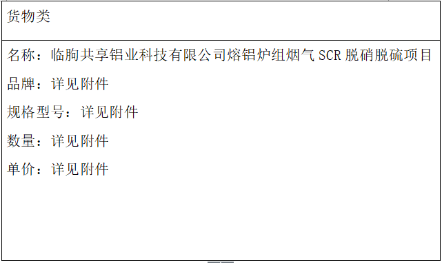 原標(biāo)題:臨朐共享鋁業(yè)科技有限公司熔鋁爐組煙氣SCR脫硝脫硫項目中標(biāo)公告