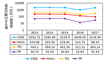 根據(jù)2013-2017年《中國統(tǒng)計(jì)年鑒》,我國廢水排放總量保持在700億噸,其中廢水中COD、氨氮(NH4+)、總氮(TN)、TP排放量如下圖,可見2015年國務(wù)院發(fā)布了《水污染防治行動(dòng)計(jì)劃》(簡稱“水十條”)后,這幾種污染物排放量得到了削減。