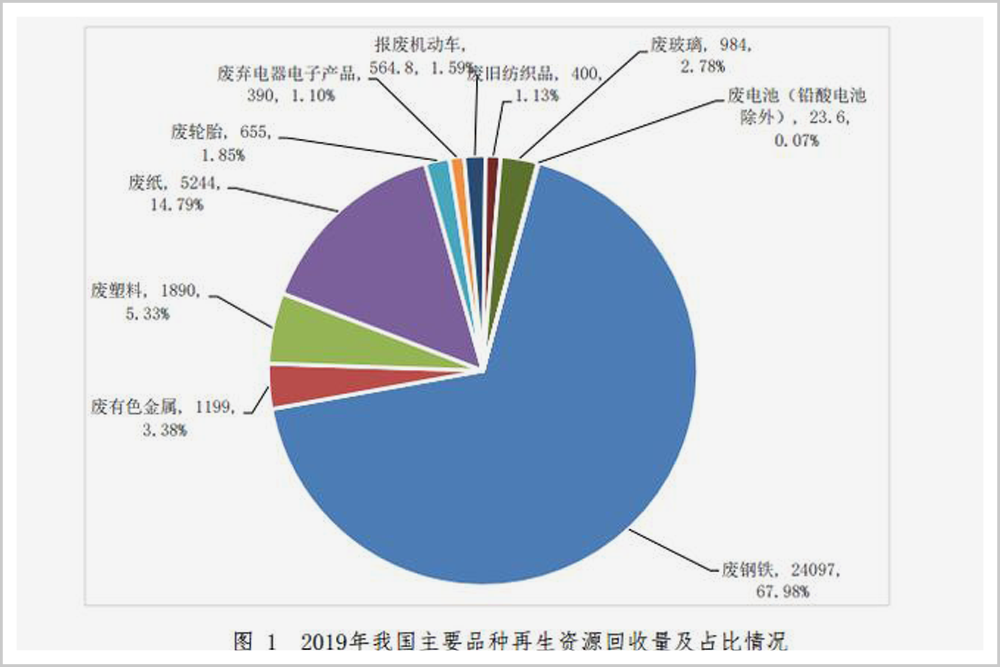 據(jù)商務(wù)部《中國(guó)再生資源回收行業(yè)發(fā)展報(bào)告(2020)》,我國(guó)可再生資源回收主要集中在廢鋼鐵、廢有色金屬、廢塑料、廢輪胎、廢紙、廢棄電器電子產(chǎn)品、報(bào)廢機(jī)動(dòng)車、廢舊紡織品、廢玻璃、廢電池等領(lǐng)域,2019年底,它們的回收總量超過3.5億噸。