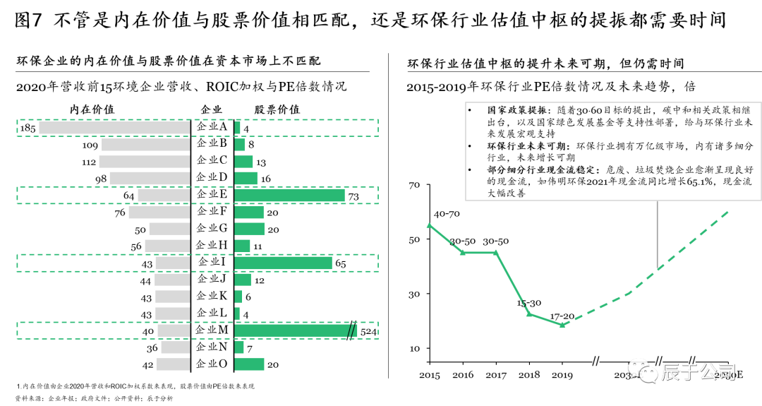 但必須承認的是,向好趨勢的背后,我國資本市場的制度完善仍需時間。首先是生態(tài)環(huán)保企業(yè)內(nèi)在價值與股票價值的相匹配需要時間,在對生態(tài)環(huán)保企業(yè)2020年營收前15強的營收、ROIC加權(quán)和PE倍數(shù)進行分析得到,多數(shù)企業(yè)(如企業(yè)A、E、I、M)的內(nèi)在價值與股票價值在資本市場上并不匹配。其次是生態(tài)環(huán)保估值中樞的提升仍需時日,盡管隨著國家政策的提振、生態(tài)環(huán)保行業(yè)的發(fā)展、部分細分行業(yè)企業(yè)現(xiàn)金流狀況的改善,環(huán)保估值中樞提升未來可期,但也并不是一蹴而就的(見圖7)。