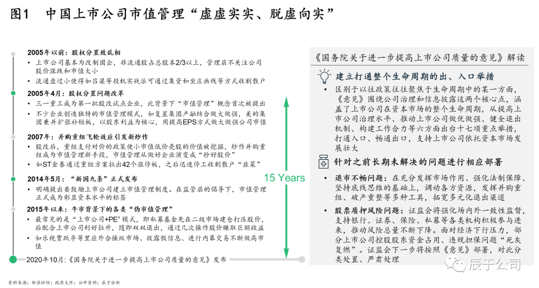 我國于2005年首次提出“市值管理”概念,但以此為名,資本市場長期出現(xiàn)各類“偽市值管理”亂象,包括背后交易拉抬股價、鼓噪并購重組吸引“韭菜”入場等,迫使政策不斷調(diào)整以規(guī)范市場,直到2020年10月,國務(wù)院發(fā)布《關(guān)于進一步提高上市公司質(zhì)量的意見》(以下簡稱《意見》),政策上打通了上市公司在資本市場的整個生命周期、部署了之前長期未解決問題的應(yīng)對措施,因而也對上市公司提出了更高要求,市值管理開始“脫虛向?qū)崱保ㄒ妶D1)。