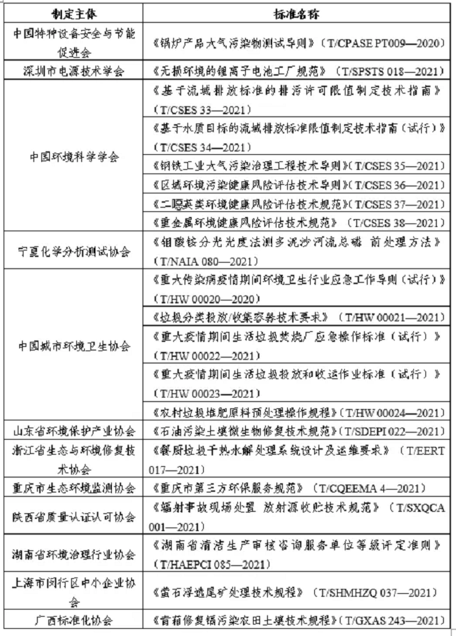 10月,全國團(tuán)體標(biāo)準(zhǔn)信息平臺公布了21項(xiàng)生態(tài)保護(hù)和環(huán)境治理類團(tuán)體標(biāo)準(zhǔn),詳見下表。