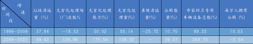從上述統(tǒng)計(jì)看。截至1989年,全國只有37座生活垃圾無害化處理場(chǎng)(廠),雖然較1979年的12座翻了幾番,但與1999年數(shù)據(jù)相比,堪稱一窮二白,為避免數(shù)值失真,筆者在計(jì)算各指標(biāo)增速時(shí)僅從1999年開始,大致以每十年為一個(gè)跨度來計(jì)算,統(tǒng)計(jì)結(jié)果如表2所示。表2 1999-2020年全國市容環(huán)衛(wèi)行業(yè)各指標(biāo)增速