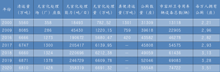 從表2可見,市容環(huán)衛(wèi)行業(yè)在2009年以后的發(fā)展可謂突飛猛進(jìn),從2009-2020年,全國垃圾清運(yùn)量增加49.43%,相比1999-2009年間,增速提升了11.6個(gè)百分點(diǎn);同一時(shí)期,無害化處理場(chǎng)數(shù)量增長126.98%,而前一個(gè)10年則是-18.53%;其他指標(biāo),垃圾無害化處理能力、垃圾無害化處理量、市容環(huán)衛(wèi)專用車輛設(shè)備總數(shù)均以倍速提升;公廁數(shù)量則增加了39.37%,而前一10年增速僅為10.70%。每萬人擁有的公廁數(shù)量是唯一一個(gè)下降的指標(biāo),考慮最近10年中國城市化的高速度,似乎也可以理解。最遺憾的還是糞便清運(yùn)量,從2017年開始就無統(tǒng)計(jì)數(shù)據(jù),而歷史數(shù)據(jù)也是上下起伏不定。糞便處置不僅與廁所革命密切相關(guān),更關(guān)系到自然水體保護(hù)和食品安全,期待糞便處置能夠得到更多重視。《年鑒》顯示,2020年,全國縣城生活垃圾清運(yùn)量達(dá)6810萬噸(約0.68億噸),總計(jì)擁有1428座無害化處理場(chǎng)(廠),生活垃圾處理能力358,319噸/日(約35.83萬噸/日),年無害化處理生活垃圾6691.32萬噸(約0.67億噸)??h城總計(jì)擁有公廁55,548座(5.55萬座),平均每萬人擁有公廁3.51座,全國縣城共擁有環(huán)衛(wèi)專用車輛設(shè)備74,722輛(約7.47萬輛)。表3 2000-2020年全國縣城市容環(huán)衛(wèi)總體情況(大致按年代跨度)