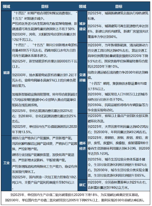 由于《方案》中的十條行動(dòng)內(nèi)容覆蓋我國碳達(dá)峰實(shí)現(xiàn)路徑上的方方面面,本文對(duì)《方案》中提到的約束性目標(biāo)做出了簡要?dú)w納,絕大多數(shù)目標(biāo)均設(shè)定了量化的指標(biāo),對(duì)未來十年的關(guān)鍵領(lǐng)域發(fā)展具有極強(qiáng)的指引作用。具體內(nèi)容如下表所示。