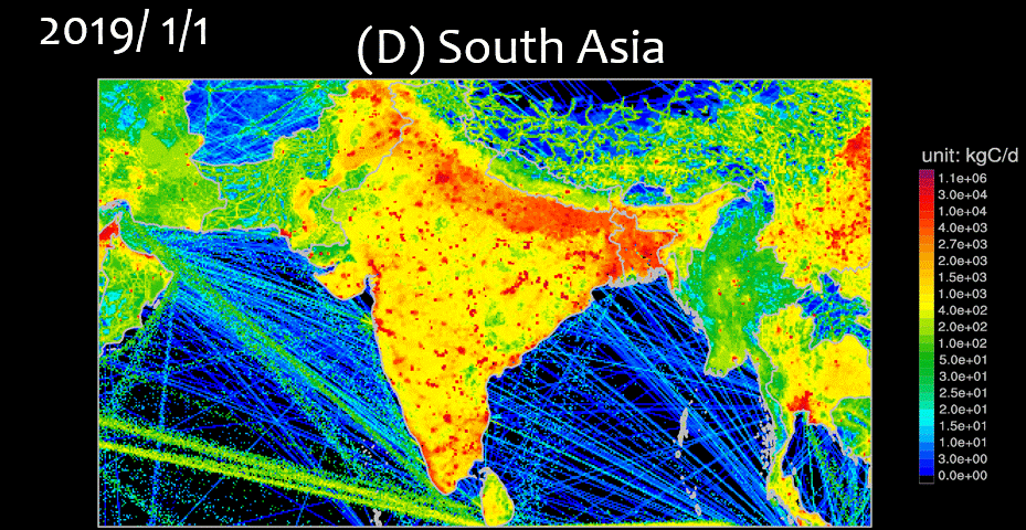 ▲圖3展示了全球四大重點排放區(qū)域的碳排放實時動態(tài)變化(A.東亞地區(qū),B.美國主體,C.歐洲,D.南亞)