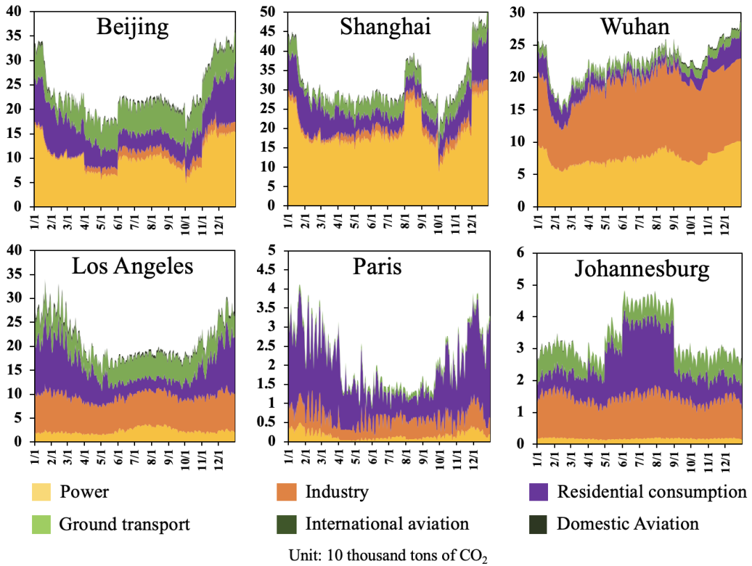 GRACED覆蓋了全球重點城市在內的關鍵排放區(qū)域,并量化表征分部門排放的時空動態(tài)特征。數據顯示,2020年中國的北京、上海、武漢城市的碳排放量在1月末首先受疫情沖擊,出現明顯下降,但在疫情得到控制后趨于平穩(wěn)。而洛杉磯、巴黎、約翰內斯堡受疫情沖擊相對較晚,在4、5月份才出現排放顯著下降(圖7)。