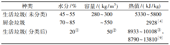 由表1可知:由于含有大量水分且容量較大的廚余垃圾被分離,分類后垃圾的水分含量約為20%,美國(19.02%)、歐洲(34.00%)、韓國(30.29%)相接近。水分降幅達(dá)到25百分點(diǎn)以上,使得可燃物質(zhì)的占比提升,單位垃圾熱值提升,同時(shí)在焚燒過程中由水分蒸發(fā)吸熱帶走的熱量也相應(yīng)減少,有利于垃圾焚燒放出熱量的充分利用。此外,分類后的生活垃圾以紙類﹑橡膠類、木竹類為主,容量明顯下降,依據(jù)加權(quán)計(jì)算結(jié)果僅為50 kg/m3,相對(duì)于同一焚燒爐來說,在保持進(jìn)料速率不變的情況下,分類后生活垃圾單位時(shí)間內(nèi)的進(jìn)料量相比未分類生活垃圾減少83%。