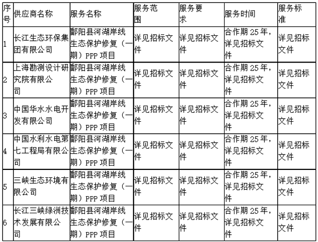 2021年11月23日,鄱陽縣河湖岸線生態(tài)保護修復(fù)(一期)PPP項目資格預(yù)審公告顯示,長江生態(tài)環(huán)保集團牽頭上海勘測設(shè)計研究院有限公司、中國華水水電開發(fā)有限公司、中國水利水電第七工程局有限公司、三峽生態(tài)環(huán)境有限公司和長江三峽綠洲技術(shù)發(fā)展有限公司中標。