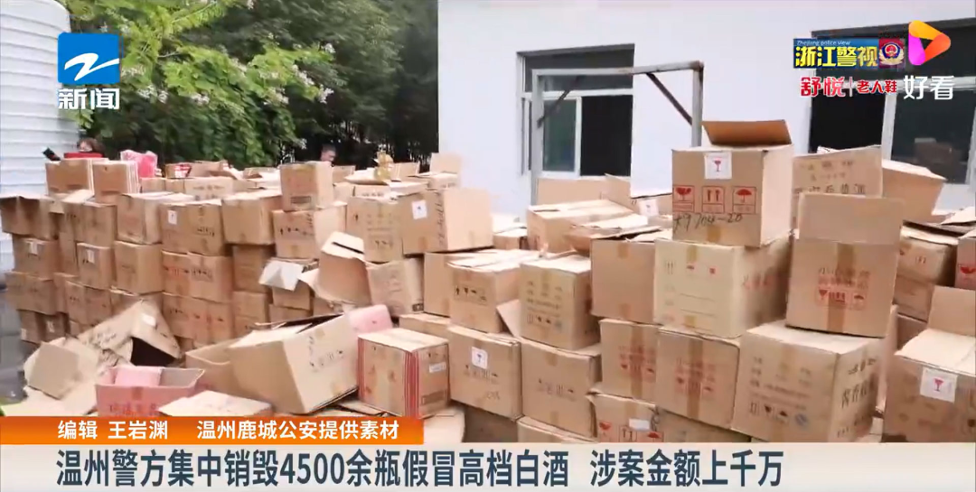 原來(lái),11月18日,浙江省溫州市鹿城區(qū)公安在當(dāng)?shù)氐挠兰挝鬯幚韽S,集中銷毀了4500余瓶假冒高檔白酒,其中主要是飛天茅臺(tái)和五糧液。