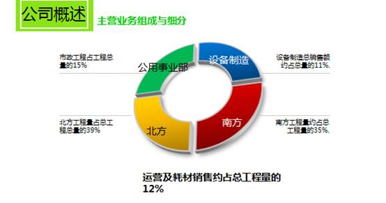 如上圖可見,紫科的主要業(yè)務(wù)細(xì)分為四大板塊,第一是設(shè)備制造,設(shè)備制造總銷售額約占總量的11%;第二是公用事業(yè)板塊,市政工程占工程總量的15%,在全國主要有兩個點。第一點在廣州總部,第二點在北京,這兩點一線負(fù)責(zé)全國市政的推廣;第三是北方板塊主要是工業(yè)板塊,總部在山東濰坊,是我們的全資子公司,北方工程量占總工程總量的39%;第四是南方板塊,總部在南京,南方工程量約占總工程量的35%。在運營和耗材的銷售,從2015年開始已經(jīng)占到總銷售額的12%。
