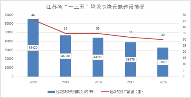 以江蘇省“十三五”垃圾焚燒建設為例,“十三五”時期,江蘇省城市生活垃圾處理設施較“十二五”新增15座,日處理能力翻了一倍,特別是2018年后,增幅明顯,這與《江蘇省環(huán)境基礎設施三年建設方案(2018——2020年)》印發(fā),組織實施一系列重點工程有關。按照《江蘇省“十四五”生態(tài)環(huán)境保護規(guī)劃》,“十四五”全省無害化能力僅計劃新增2萬噸/日,餐廚廢棄物處理能力計劃新增2000噸/日。