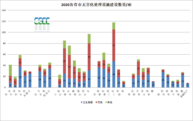 截至2020年,廣東、山東、江蘇、浙江四個省無害處理設施建設數(shù)量領跑,分別為118座、97座、85座和76座,它們建設的垃圾焚燒處理設施也最多,分別擁有57座、49座、46座、43座。而衛(wèi)生填埋場相對較多的省市則是廣東省(48座)、河北省(38座),河南省(36座),湖北省(34座)。按區(qū)域來看,華北地區(qū)、華中地區(qū)以及西南地區(qū)、東北地區(qū)建設垃圾填埋場數(shù)量明顯多于華東、華南地區(qū)。