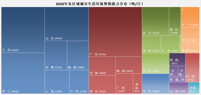 如果從無害化處理能力來看,又是另一番景象。廣東、山東、江蘇、浙江四省無害化處理能力仍然領跑,其中垃圾焚燒處理能力分別達到87416噸/日、49450噸/日、65420噸/日、58630噸/日。可以看到排序略有變化,江蘇、浙江的垃圾焚燒處理能力高于山東省,推算如果論平均單體垃圾焚燒項目規(guī)模,江蘇和浙江省高于山東省。數(shù)據(jù)中還可以看到,這幾個省份是大力發(fā)展生活垃圾焚燒的省份,不僅焚燒廠建得多,而且垃圾焚燒日處理能力和處理量也處在突出高位。