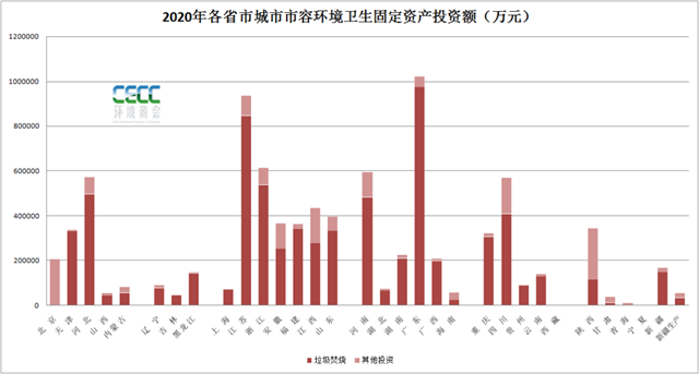 從區(qū)域來看,2020年,廣東(97.3億元)、江蘇(84.6億元)、浙江(53.7億元)以及河北(49.7億元)、河南(48.3億元)等地環(huán)境市容衛(wèi)生設施建設投入較大,其中大部分資金用于垃圾處理設施建設。整個“十三五”時期,北京、廣東、江蘇等地城市環(huán)境衛(wèi)生固定資產(chǎn)投資較大,其中北京五年的投資額接近400億,特別是2016年、2017年兩年,投資額均在百億以上。