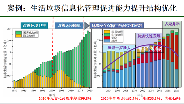 劉建國提到,我國城市垃圾治理從過去簡單處理來改善環(huán)境衛(wèi)生到改善環(huán)境質量再到環(huán)境安全保障與氣候變化應對的新階段。2020年無害化處理率超過99.8%,但這不是說相當于100分考了99.8分,而是100個人當中有99.8個人超過了60分,其實還有很大進步空間。2020年,城市生活垃圾焚燒占比62.3%,填埋33.1%,其他4.6%。垃圾無害化處理經(jīng)過了填埋一家獨大、焚燒快速發(fā)展到多元并舉的過程,整個處理系統(tǒng)的結構在不斷優(yōu)化。