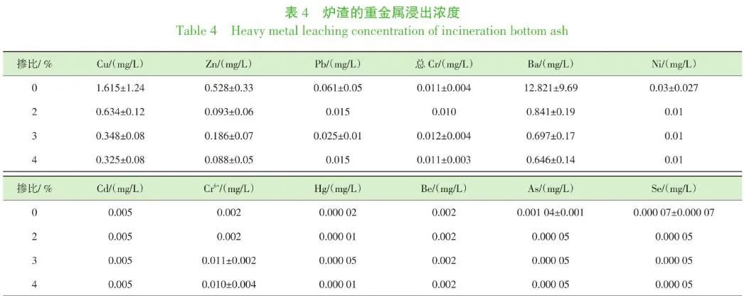 圖3(b) 顯示了爐渣中浸出濃度較少的6種重金屬,未檢出的重金屬含量在統(tǒng)計時按檢出限的 1/2進(jìn)行處理,除了Cr6+之外,生活垃圾摻入醫(yī)療廢物摻燒后爐渣重金屬含量少且變化基本不大,部分尚未達(dá)到檢出限。根據(jù)醫(yī)療廢物焚燒處理的要求,一般將醫(yī)療廢物分為含氯塑料、非含氯塑料、橡膠、織物、紙類、棉竹、玻璃、金屬及其他9類。塑料可以使醫(yī)療廢物具有較高的熱值,便于焚燒爐的焚燒處理。醫(yī)療廢物摻入比例較少時Cr6+含量基本不變,隨著醫(yī)療廢物摻入比例的增加,Cr6+的浸出濃度有所提高,這一方面是因為Cr6+可能由醫(yī)療廢物帶入,另一方面醫(yī)療廢物的高熱值有利于促進(jìn)焚燒完全進(jìn)行,同時醫(yī)療廢物摻燒量對焚燒爐運(yùn)行工況的影響小節(jié)中所述的通風(fēng)量上升引起氧化性氣氛加強(qiáng),在氧氣供應(yīng)充足的條件下促進(jìn)了Cr的氧化,爐渣中Cr6+濃度可能有所增加。 生活垃圾焚燒爐渣中重金屬的含量波動很大,關(guān)于醫(yī)療廢物單獨(dú)焚燒爐渣中重金屬的零星研究顯示,醫(yī)療廢物焚燒爐渣的重金屬含量在垃圾焚燒底渣的含量范圍之內(nèi)。圖3和表4顯示醫(yī)療廢物摻燒后爐渣的重金屬浸出濃度處于其他焚燒廠僅焚燒生活垃圾獲得的爐渣重金屬浸出濃度范圍內(nèi)。顯著性分析表明:不同比例的醫(yī)療廢物摻燒后主要對于生活垃圾焚燒爐渣中重金屬Cu、Zn、Pb、Ba、Cr6+和As的浸出濃度有影響,對于其他重金屬的浸出并無明顯影響;而且除Cr6+外其他重金屬浸出濃度反而下降。對于Cr6+,摻燒比為2%時與未摻燒無顯著性差異,摻燒比增加到3%和4%時,Cr6+的浸出濃度雖然上升,但是也遠(yuǎn)遠(yuǎn)低于限值5 mg/L。故摻燒醫(yī)療廢物對生活垃圾焚燒爐渣重金屬浸出特性總體上沒有顯著的影響。