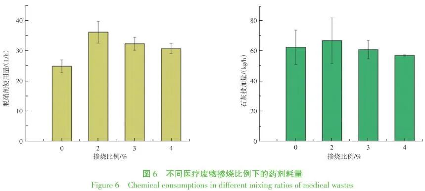 由圖4可以看出,生活垃圾日常運(yùn)行熱處理焚燒煙氣中CO本身含量較低,平均為1.72 mg/m3,遠(yuǎn)低于排放標(biāo)準(zhǔn)的限值。摻燒醫(yī)療廢物后煙氣中CO含量顯著升高,當(dāng)摻燒比例為3%時,CO平均含量達(dá)13.78 mg/m3,是日常運(yùn)行工況下的8倍,但是仍然遠(yuǎn)低于標(biāo)準(zhǔn)值,其上偏差雖然有7.33 mg/m3,但是仍低于排放限值。2%和4%的摻燒比例下,煙氣中CO的含量增加,分別是日常運(yùn)行條件下的3.8倍和2.2倍,但是明顯低于摻燒比例為3%的工況。顯著性分析發(fā)現(xiàn)P<0.05,說明摻燒醫(yī)療廢物對焚燒煙氣中CO含量有明顯影響,且呈現(xiàn)增加的趨勢。這是因為醫(yī)療廢物的熱值偏高,即使在供風(fēng)相應(yīng)地調(diào)整前提下,可能會因為局部熱負(fù)荷高、在高溫區(qū)停留時間縮短而引起CO升高。 醫(yī)療廢物的Cl典型含量為1.1%~2.1%,而生活垃圾在0.2%~0.8%的水平。但是表2中數(shù)據(jù)顯示醫(yī)療廢物的Cl含量雖然偏高,但是未達(dá)到上述水平,這可能與醫(yī)療廢物的來源及取樣有關(guān)。由圖5可以看出,日常運(yùn)行焚燒煙氣中HCl平均含量為3.32 mg/m3,在生活垃圾中摻燒醫(yī)療廢物后煙氣中HCl含量略有降低,這可能是因為進(jìn)料波動引起的。在2%摻燒比例下煙氣中HCl含量變化不大,僅為3.30 mg/m3,基本與日常運(yùn)行條件下的含量持平,但是石灰投加量有所增加,如圖6所示。摻燒比例為3%和4%時,HCl濃度反而降低明顯,對應(yīng)地石灰的消耗量也有所降低,這可能與生活垃圾的組分波動有關(guān),因為摻燒試驗時間長達(dá)8 d,生活垃圾組分和醫(yī)療廢物組分均可能出現(xiàn)變化,也說明垃圾組分本身的波動可能掩蓋小比例的醫(yī)療廢物摻燒的影響。