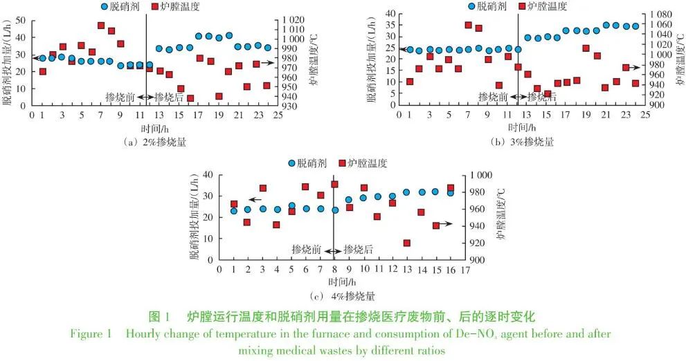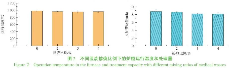這里主要關(guān)注醫(yī)療廢物摻燒對焚燒爐爐膛溫度和焚燒處理量的影響。圖1給出每個摻燒比例前后的爐膛溫度和脫硝劑用量的逐時變化。其中摻燒比例為2%和3%(wt)時,前12 h為日常運(yùn)行情況,后12 h為摻燒后的代表性工況;摻燒比例為4%(wt)時,前8 h為日常運(yùn)行情況,后8 h為摻燒后的代表性工況。將上述逐時溫度按照不同醫(yī)療廢物添加量工況取平均值,結(jié)果見圖2,圖2同時給出了實際的入爐垃圾焚燒量??梢?,日常運(yùn)行爐膛內(nèi)溫度較高,平均可達(dá)982.72 ℃,在摻燒醫(yī)療廢物后爐膛溫度略有降低,這可能是由于供風(fēng)量隨著醫(yī)療廢物摻燒比例的增加而增大引起的變化,但是不同摻燒比例下運(yùn)行溫度變化不大,無顯著性差異,總體上運(yùn)行溫度在正常波動范圍內(nèi),并高于850 ℃。