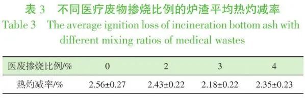 如表3所示,日常焚燒生活垃圾爐渣平均熱灼減率為2.56%,而摻燒醫(yī)療廢物的爐渣范圍是2.18%~2.43%,較原爐渣略有下降,這是因為醫(yī)療廢物熱值較高,可促進(jìn)爐渣中的碳燃盡。