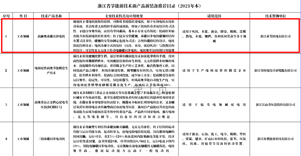 近日,浙江永發(fā)機(jī)電有限公司(下稱“永發(fā)機(jī)電”)作為電機(jī)行業(yè)集眾家之所長(zhǎng)者,拓荒深耕之下,其高新效永磁直驅(qū)電機(jī)技術(shù)榮獲浙江省發(fā)展改革委的認(rèn)可與推薦,入選《浙江省節(jié)能新技術(shù)新產(chǎn)品新裝備推薦目錄(2021年本)》。