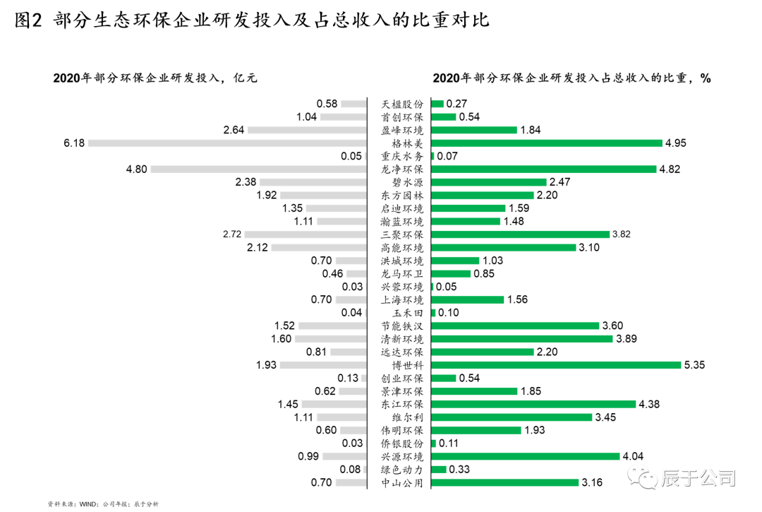 造成以上問題的原因很多,主要有兩個:一是國內(nèi)生態(tài)環(huán)保行業(yè)之前一直處于簡單、粗暴的“跑馬圈地”時代,強政府關(guān)系和低成本融資成為這一階段企業(yè)制勝的“不二法寶”,這種“浮躁”的大環(huán)境導(dǎo)致很多企業(yè)“重投建、輕技運”;二是創(chuàng)新型和革新型技術(shù)投入周期長,回報不明顯,很多企業(yè)尤其是三年任期制下的國企高層們?nèi)狈ψ銐蚰托?,容錯機制缺失也讓他們對高風(fēng)險的研發(fā)投入持謹慎態(tài)度,這從生態(tài)環(huán)保領(lǐng)域的上市企業(yè)的研發(fā)投入占收入的比重可見一斑(見圖2)。