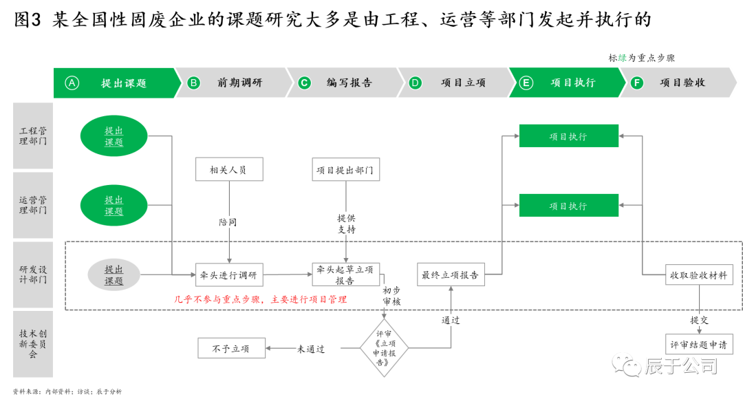 我們也注意到,很多生態(tài)環(huán)保企業(yè)研發(fā)活動的起點并非由戰(zhàn)略驅(qū)動,更多來自工程、運營等業(yè)務(wù)上的具體問題,技術(shù)研發(fā)則處于配合和支持其他部門的位置,引領(lǐng)性不足(見圖3)。由于缺乏對公司未來發(fā)展的前瞻性思考,他們也并未對各細分市場的發(fā)展趨勢、競爭對手、客戶需求、政策法規(guī)等進行深入分析,明確的產(chǎn)品規(guī)劃包括產(chǎn)品類型定義、定位以及如何與競爭對手實現(xiàn)差異化戰(zhàn)略等也就無從說起。