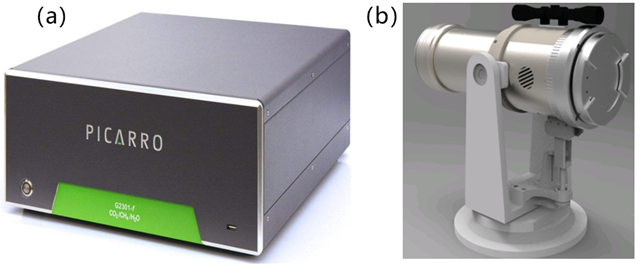 圖2.(a)原位點(diǎn)式CRDS監(jiān)測(cè)儀(b)區(qū)域開放式TDLAS監(jiān)測(cè)儀