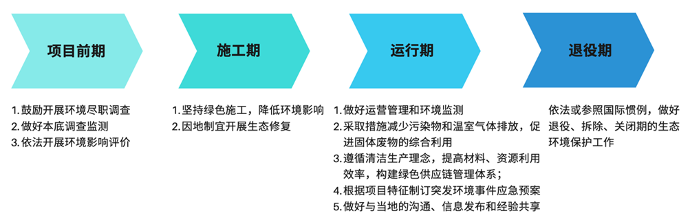 與2013版相比,2022版《指南》延續(xù)了2021版《工作指引》所鼓勵的“全周期”管理的精神,針對對外投資合作建設(shè)項(xiàng)目全生命周期中的每一個階段,包括項(xiàng)目前期、施工期、運(yùn)行期、退役期,都提出了具體的要求(見圖3)。其中,對每個階段的指引不僅涉及了污染防治、應(yīng)對氣候變化、生物多樣性保護(hù)等多維度,而且對標(biāo)了國際通行規(guī)則標(biāo)準(zhǔn)或中國更嚴(yán)格標(biāo)準(zhǔn)。