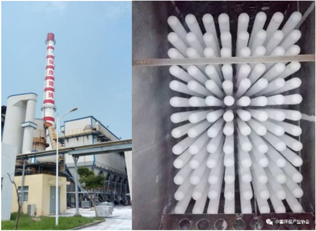 2021年12月11日,中國(guó)環(huán)境保護(hù)產(chǎn)業(yè)協(xié)會(huì)組織召開(kāi)了福建龍凈環(huán)保申請(qǐng)的“HLT型高溫復(fù)合濾筒塵硝協(xié)同脫除裝備”成果鑒定會(huì),該成果是龍凈環(huán)保針對(duì)玻璃窯爐、水玻璃窯、生物質(zhì)鍋爐煙氣溫度高、成分復(fù)雜、污染物濃度高等工況條件,自主研發(fā)的塵硝協(xié)同脫除裝備,該裝備以復(fù)合脫硝催化劑的無(wú)機(jī)纖維濾筒(復(fù)合濾筒)為核心處理部件,通過(guò)將脫硝催化劑植入濾筒內(nèi)部,實(shí)現(xiàn)顆粒物、氮氧化物等多污染物協(xié)同治理。該成果在低阻、高效無(wú)機(jī)纖維濾筒制備及寬溫度窗口(200℃~400℃)催化劑植入濾筒等方面具有創(chuàng)新性,已在玻璃窯、生物質(zhì)鍋爐、石灰窯等工業(yè)窯爐多污染物高效協(xié)同脫除中成功應(yīng)用(圖4),顆粒物、二氧化硫和氮氧化物出口濃度分別低于10mg/m³、35mg/m³和50mg/m³。