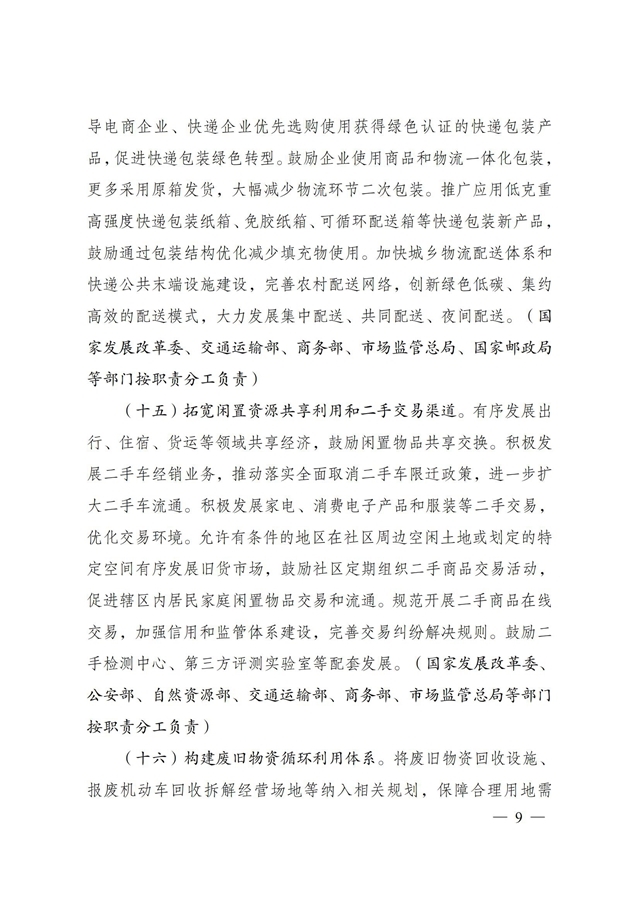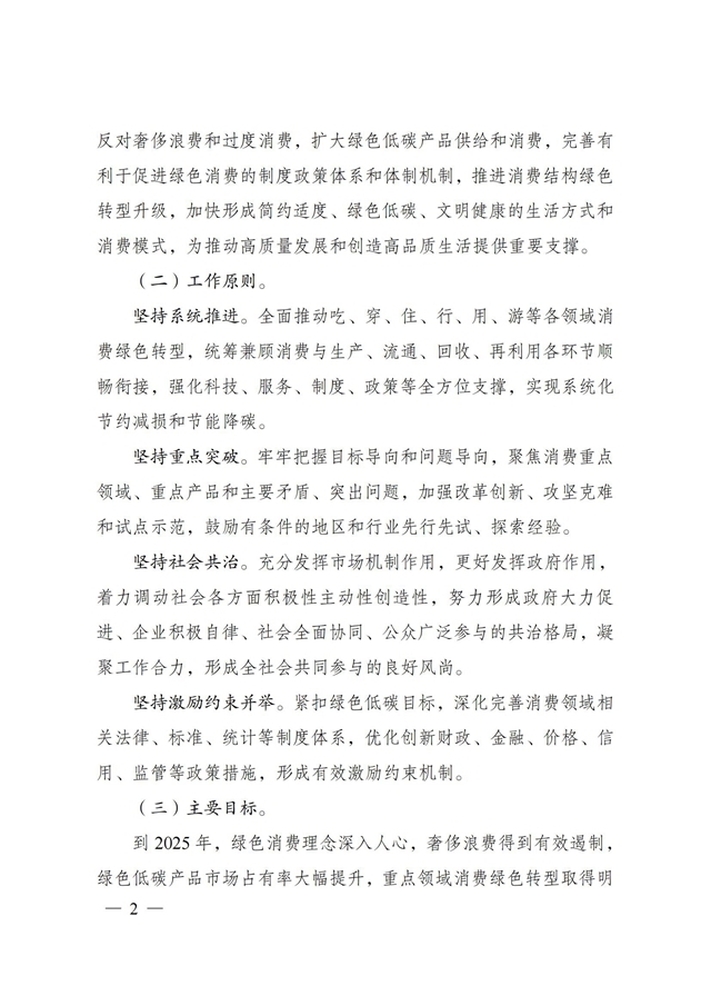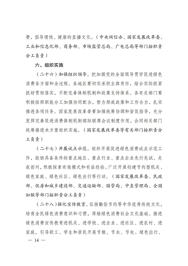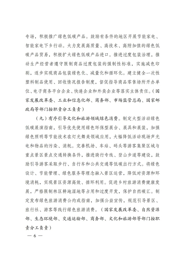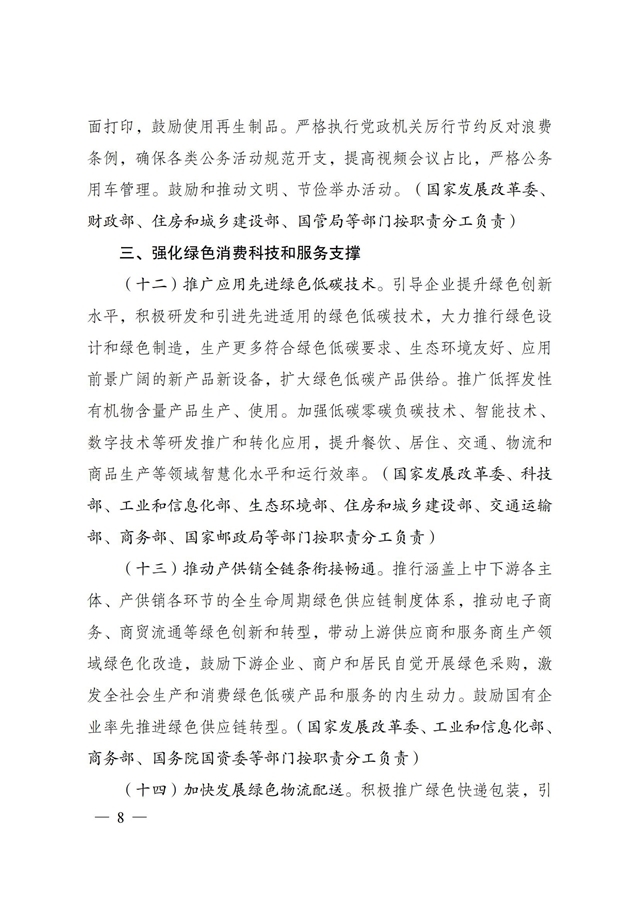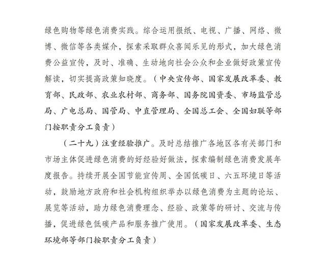 為深入貫徹落實《中共中央、國務院關于完整準確全面貫徹新發(fā)展理念做好碳達峰碳中和工作的意見》和《2030年前碳達峰行動方案》有關要求,根據(jù)碳達峰碳中和工作領導小組部署安排,國家發(fā)展改革委、工業(yè)和信息化部、住房和城鄉(xiāng)建設部、商務部、市場監(jiān)管總局、國管局、中直管理局會同有關部門研究制定了《促進綠色消費實施方案》?,F(xiàn)印發(fā)給你們,請結合實際,認真抓好貫徹落實。