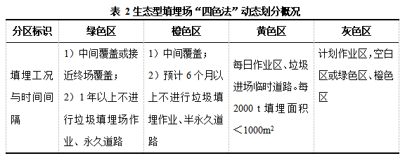 垃圾填埋場的生命周期主要分為三個(gè)階段:建設(shè)階段、運(yùn)行階段和封場修復(fù)階段。垃圾填埋場應(yīng)根據(jù)《生活垃圾衛(wèi)生填埋場處理工程項(xiàng)目建設(shè)標(biāo)準(zhǔn)》(建標(biāo)124-2009)建設(shè),建設(shè)項(xiàng)目主要包括填埋場主體工程與設(shè)備、配套工程和生產(chǎn)管理與輔助設(shè)施及生活服務(wù)設(shè)施等,建設(shè)完成后進(jìn)入運(yùn)行階段。衛(wèi)生填埋場運(yùn)行管理應(yīng)符合《生活垃圾填埋場運(yùn)行管理規(guī)范》(DB11/T 270-2014)。在運(yùn)行階段,生態(tài)型填埋場采用 “四色法”(國作登字-2020-L-01092309)對填埋場進(jìn)行動態(tài)劃分,即綠色區(qū)、黃色區(qū)、灰色區(qū)和橙色區(qū),詳見表2。