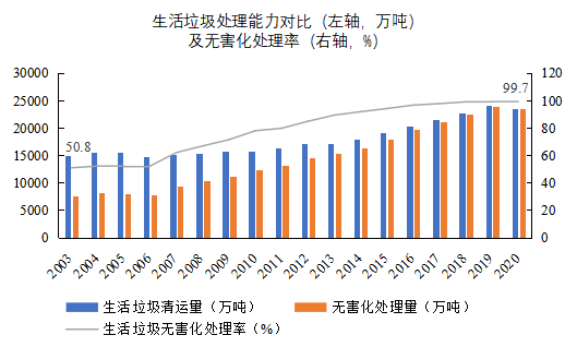 目前,生活垃圾處理方式主要分為衛(wèi)生填埋、焚燒和堆肥。我國垃圾產(chǎn)生量逐年增加(圖1),生活垃圾清運(yùn)量由2003年的14856.5萬噸增長至2020年的23511.7萬噸,生活垃圾無害化處理量由2003年的7544.7萬噸增長至2020年的23452.3萬噸,無害化處理率由50.8%增長至99.7%,其中,衛(wèi)生填埋占比由2003年的84.9%降低至2020年的33.1%。近年來,我國對環(huán)保日益重視,垃圾處理的“減量化、資源化、無害化”的水平逐漸提升,基本實(shí)現(xiàn)生活垃圾無害化處理。