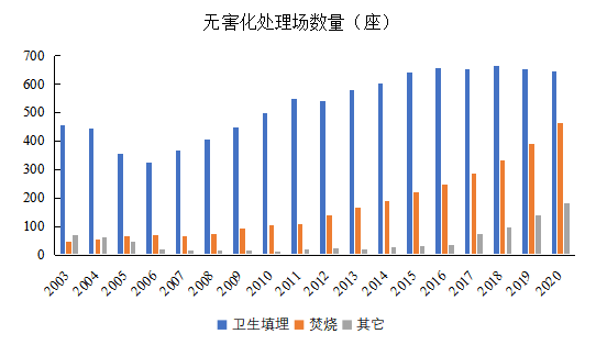 圖2 我國2003-2020年不同類型的無害化處理場數(shù)量(數(shù)據(jù)來源:中國統(tǒng)計(jì)年鑒)
