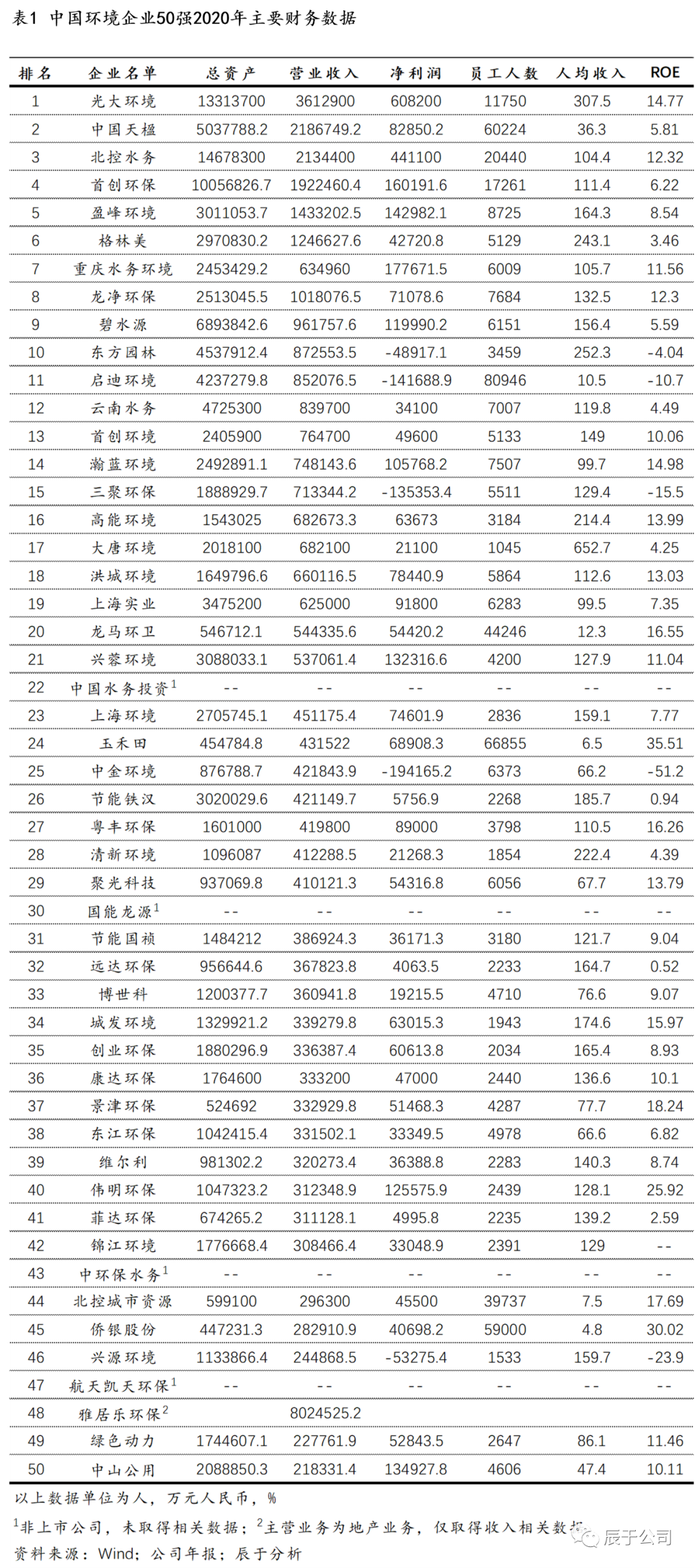 2021年7月全國工商聯(lián)環(huán)境商會(huì)發(fā)布了最新一期的中國環(huán)境企業(yè)50強(qiáng)榜單,辰于對(duì)榜單中企業(yè)的主要財(cái)務(wù)數(shù)據(jù)(見表 1)進(jìn)行統(tǒng)計(jì)發(fā)現(xiàn),光大環(huán)境高居榜首收入達(dá)到361億元,超過第二名65%;企業(yè)需要收入超過21億元才能進(jìn)入50強(qiáng),超過87億元才能進(jìn)入前10強(qiáng);由于主營業(yè)務(wù)差異,各企業(yè)在人均收入、ROE等指標(biāo)上也有較大差距,環(huán)衛(wèi)行業(yè)的企業(yè)人均收入都比較低,其他領(lǐng)域的人均收入平均150萬元左右。