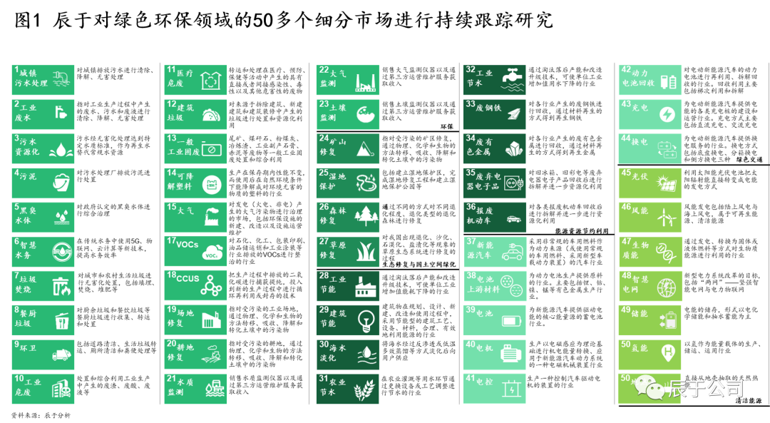 作為一家聚焦于綠色發(fā)展領(lǐng)域的專業(yè)咨詢機(jī)構(gòu),結(jié)合以往項(xiàng)目經(jīng)驗(yàn)以及業(yè)內(nèi)習(xí)慣,辰于對(duì)綠色環(huán)保行業(yè)范圍進(jìn)行了明確劃分,目前已經(jīng)持續(xù)跟蹤50多個(gè)細(xì)分領(lǐng)域(見圖1)。有意思的一點(diǎn)是,過去的環(huán)保行業(yè)范圍一般是指包含供水、各類污染物末端處置和治理以及環(huán)境監(jiān)測在內(nèi)的傳統(tǒng)環(huán)保領(lǐng)域,雙碳戰(zhàn)略提出后,當(dāng)人們談到“環(huán)?!睍r(shí),更多是指“綠色環(huán)?!钡母拍?,節(jié)能、清潔能源、雙碳業(yè)務(wù)等行業(yè)也被納入。