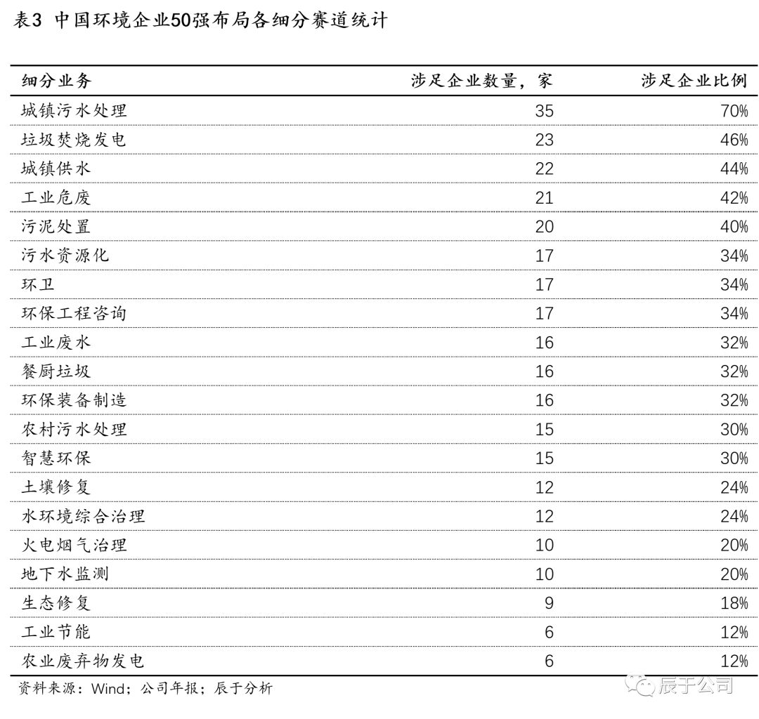 更細(xì)分去看,城鎮(zhèn)污水處理、垃圾焚燒發(fā)電、城鎮(zhèn)供水、工業(yè)危廢等是中國環(huán)境企業(yè)50強(qiáng)布局最多的細(xì)分領(lǐng)域(見表3),這些領(lǐng)域基本都是規(guī)模上千億甚至數(shù)千億的市場,“盤子”足夠大,商業(yè)模式穩(wěn)定,是環(huán)境強(qiáng)企必爭之地。