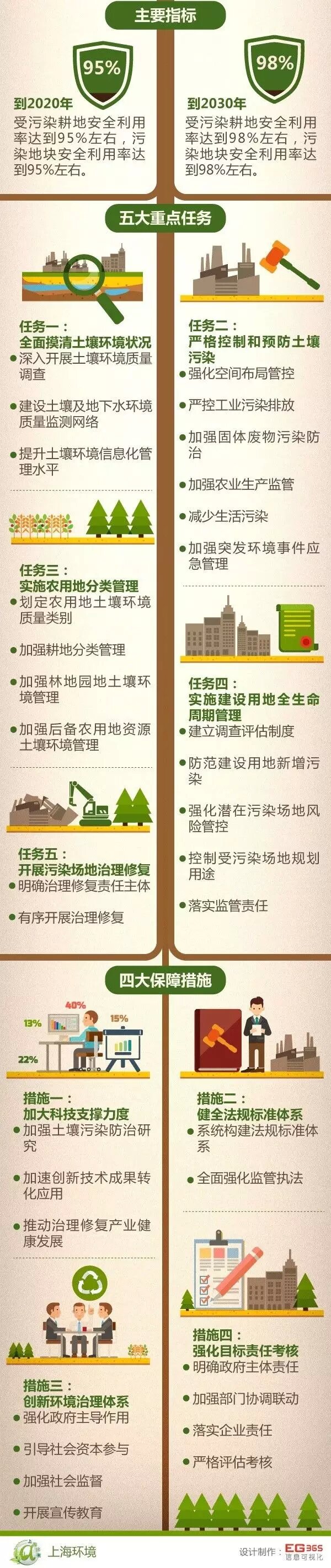 《實施方案》圍繞一個總體目標,緊扣五大重點任務(wù),落實四大保障措施,共提出10條、33款措施內(nèi)容和具體任務(wù),對上海土壤污染防治工作做出了全面戰(zhàn)略部署,這是當(dāng)前和今后一段時期上海土壤污染防治工作的行動綱領(lǐng)。