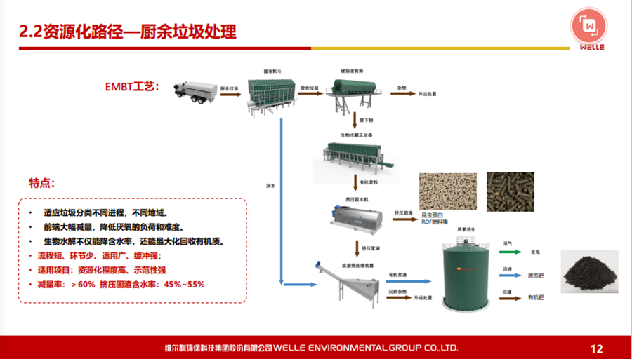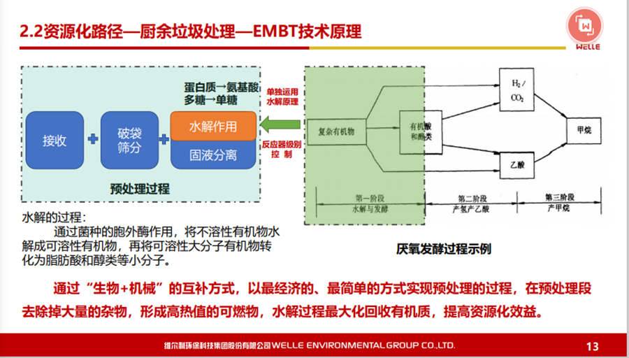 對于濕垃圾或者是廚余垃圾,我們特別推出一款技術(shù)——EMBT技術(shù)。結(jié)合生物水解技術(shù),原理是有機(jī)廢棄物或者有機(jī)物在厭氧發(fā)酵過程當(dāng)中主要是通過酸化水解以及產(chǎn)甲烷兩個(gè)階段,我們通過設(shè)施化的反應(yīng)器,把酸化水解在前面就能夠作為預(yù)處理,真正地溶解到水下面的有機(jī)物再到厭氧處理,這樣使得厭氧反應(yīng)器不要那么復(fù)雜,剩下的固渣資源化也會比較方便,去做水量化的利用都是可行的。這個(gè)工藝現(xiàn)在在上海包括在紹興做下來,還是受到比較多的認(rèn)可。