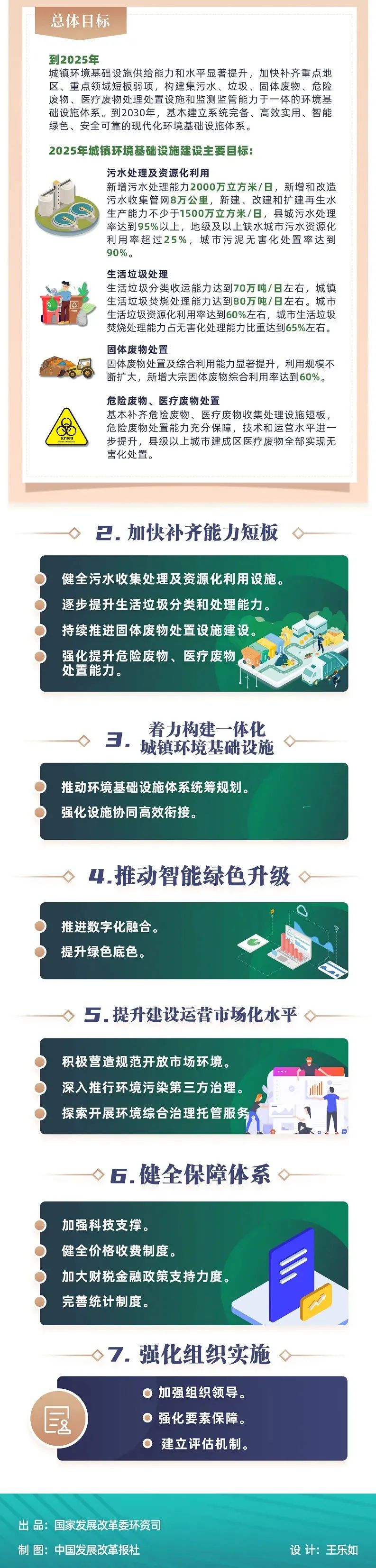 “環(huán)境基礎(chǔ)設(shè)施是基礎(chǔ)設(shè)施的重要組成部分,是深入打好污染防治攻堅(jiān)戰(zhàn)、改善生態(tài)環(huán)境質(zhì)量、增進(jìn)民生福祉的基礎(chǔ)保障,是完善現(xiàn)代環(huán)境治理體系的重要支撐?!眹?guó)家發(fā)展改革委相關(guān)負(fù)責(zé)同志在回答記者提問(wèn)時(shí)介紹,《指導(dǎo)意見(jiàn)》充分考慮現(xiàn)有城鎮(zhèn)環(huán)境基礎(chǔ)設(shè)施工作基礎(chǔ)上,提出到2025年,城鎮(zhèn)環(huán)境基礎(chǔ)設(shè)施供給能力和水平顯著提升,加快補(bǔ)齊重點(diǎn)地區(qū)、重點(diǎn)領(lǐng)域短板弱項(xiàng),構(gòu)建集污水、垃圾、固體廢物、危險(xiǎn)廢物、醫(yī)療廢物處理處置設(shè)施和監(jiān)測(cè)監(jiān)管能力于一體的環(huán)境基礎(chǔ)設(shè)施體系;到2030年,基本建立系統(tǒng)完備、高效實(shí)用、智能綠色、安全可靠的現(xiàn)代化環(huán)境基礎(chǔ)設(shè)施體系的總體目標(biāo)。明確到2025年新增污水處理能力2000萬(wàn)立方米/日、生活垃圾分類(lèi)收運(yùn)能力達(dá)到70萬(wàn)噸/日左右、新增大宗固體廢物綜合利用率達(dá)到60%等多項(xiàng)具體目標(biāo)。