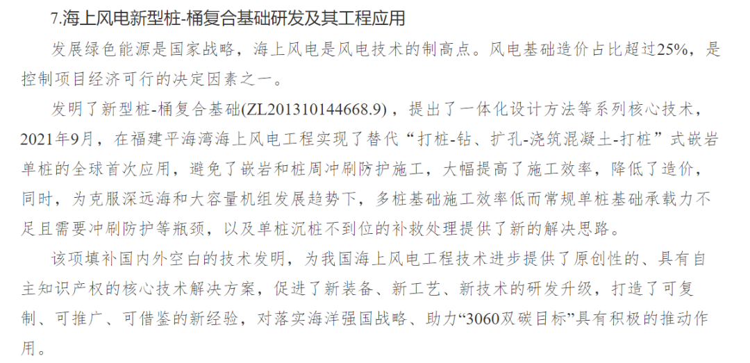 日前,華東院海上風(fēng)電“新型樁-桶復(fù)合基礎(chǔ)研發(fā)及其工程應(yīng)用”入選2021年度中國十大海洋科技進(jìn)展。這項由華東院發(fā)明并創(chuàng)新設(shè)計的核心技術(shù),不僅大幅提高了海上施工作業(yè)效率,也為破解海上風(fēng)電走向深遠(yuǎn)海、大機組過程中常規(guī)單樁基礎(chǔ)承載力不足等難題,提供可復(fù)制、可推廣、可借鑒的經(jīng)驗與思路,為國家海洋技術(shù)領(lǐng)域發(fā)展、助力“3060雙碳目標(biāo)”,發(fā)揮積極作用。