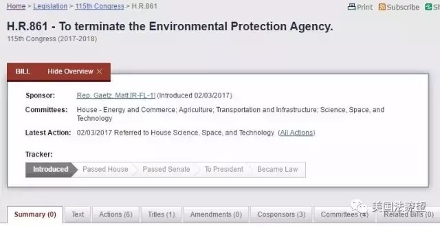 美國國會網(wǎng)站公布的“關(guān)于撤銷環(huán)境保護(hù)局議案”