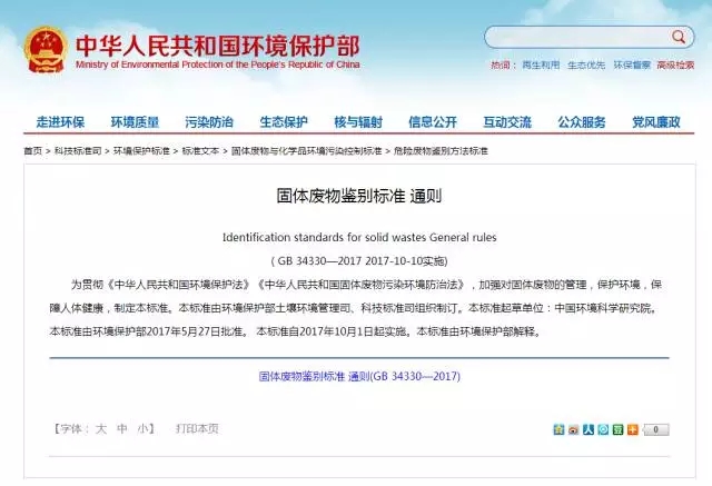 因此,為了統(tǒng)一各個檢驗機構(gòu)或鑒別機構(gòu)鑒別固體廢物的尺度,保證鑒別質(zhì)量和鑒別結(jié)果的公正和可靠,環(huán)境保護部與國家質(zhì)量監(jiān)督檢驗總局聯(lián)合發(fā)布《固體廢物鑒別標準  通則》(GB 34330-2017)。該標準是我國首次制定的關(guān)于固體廢物的鑒別標準,具有強制執(zhí)行的效力。